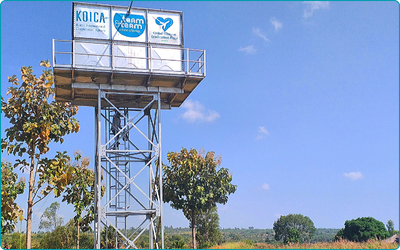 태양광 에너지를 활용하여 개발된 관정에서 지하수를 끌어올려 평균 5~10m 높이의 물탱크에 물을 저장합니다. 저장된 물은 추후 마을 식수대까지 파이프라인을 연결하여 중력으로 흘려보냅니다.